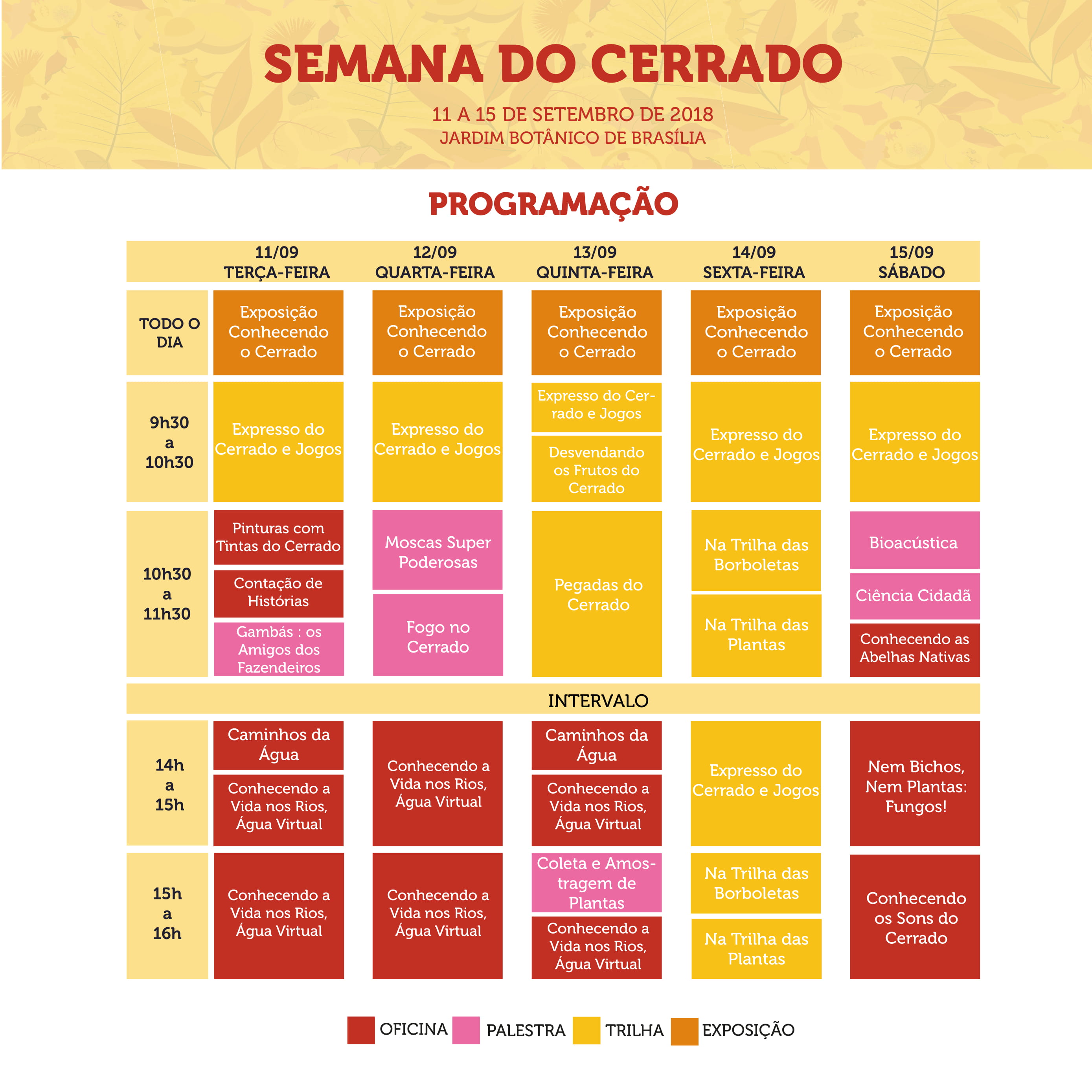Para apresentar toda essa diversidade e, ainda, alertar para os riscos que o cerrado vem correndo devido ao desmatamento que já tirou 50% do cerrado, o programa PELD Cerrado realizará, entre os dias 11 e 15 de setembro o evento 'Semana do Cerrado', no Jardim Botânico de Brasília. Aberto para o público de todas as idades, a Semana contará com atividades bem didáticas, com jogos, exposição, oficinas, histórias, trilhas, óculos de realidade virtual, entre outros.